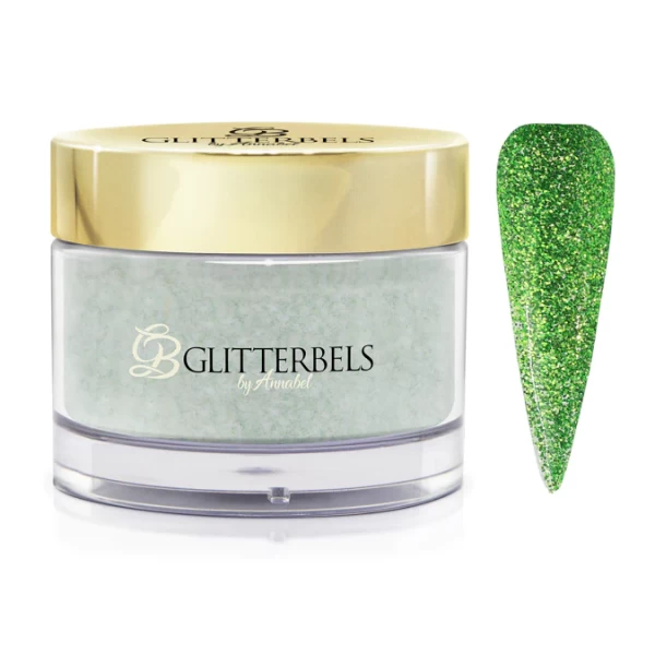 Transparante acryl poeder van het merk Glitterbels, met groene glitters.