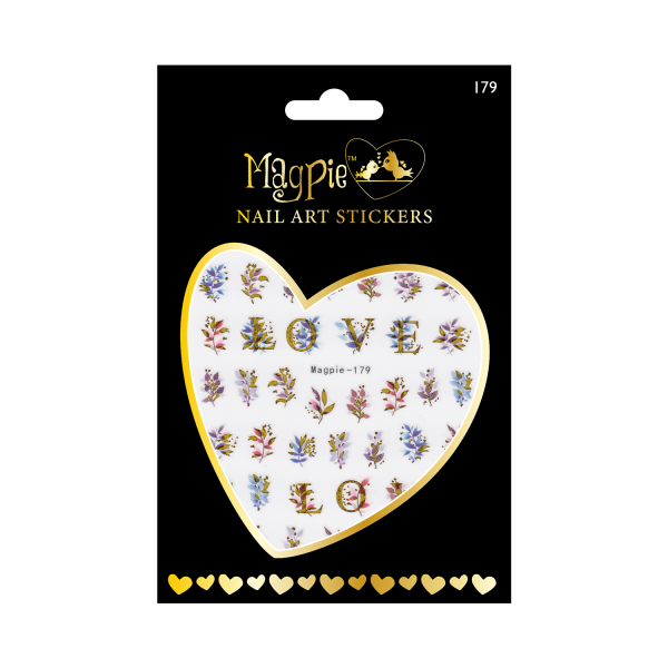 Nail-art stickers van het Merk Magpie, met bloemen en blaadjes, en letters LOVE