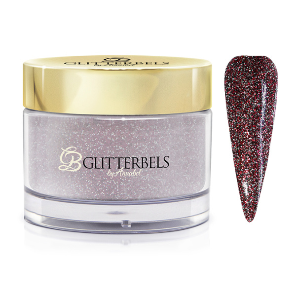 Transparante acryl poeder, met wijnrode en zilveren glitters, van het merk Glitterbels.