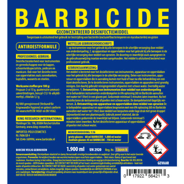 - Let Op: Barbicide is een bij het Ctgb – College voor toelating gewassen en biociden – geregistreerd desinfectiemiddel onder nummer 13644N. Dit is in Nederland verplicht en zonder dit nummer mag Barbicide niet in Nederland verkocht worden